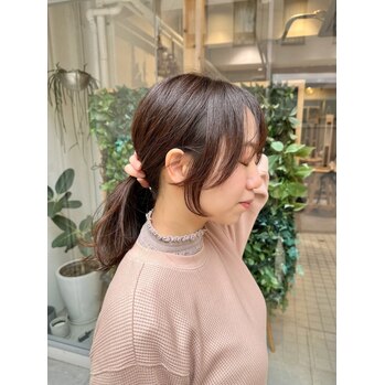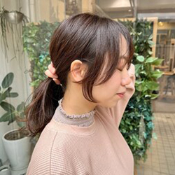 顔まわりのスタイルは、全体の印象を大きく左右する重要なポイントです!お客様の顔の形やライフスタイルに合わせて、くくった時や下ろした時の小顔効果を最大限に引き出すスタイルをご提案します。カラーはツヤ感のあるほんのりピンクベージュで、優しく女性らしい印象を演出します!