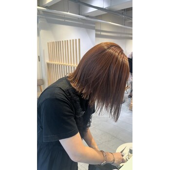 今回は、切りっぱなしのミディアムヘアをマロンベージュカラーに仕上げました!とても可愛くて、お客様にも大変気に入っていただけました♪