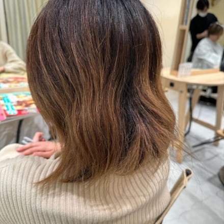 最近注目の【ブリーチなしダブルカラー】 こんな方におすすめ! ダメージが気になる髪を傷めずにカラーを楽しみたい方にぴったり! ブリーチする勇気はないけど明るくしたいブリーチなしでも明るさを実現します。 透明感のある暗髪カラーがしたい自然な透...